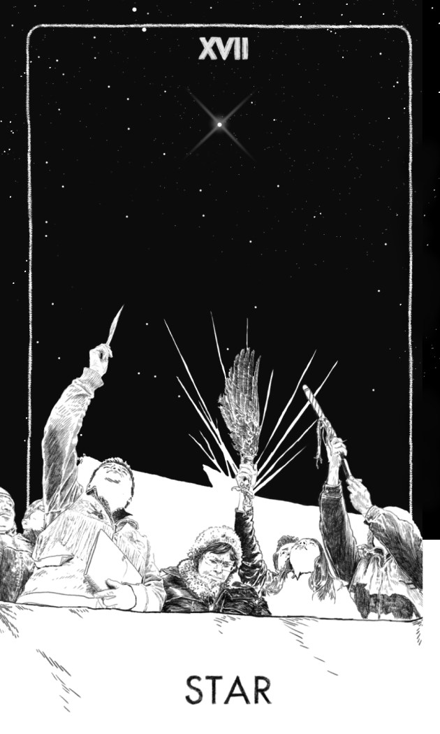IN DEPTH:The Star card shows up as a group in protest, a group in ceremony. A group that has travelled great distances across time and space. Their leader embarks upon a a hunger strike, a ritual of immense self-control, commitment, and physical vulnerability. She offers her body, her pain, her visible suffering as a bridge between worlds—between colonial state and tribal nation, between people and earth, between indigenous and non-indigenous, between seen and unseen. She calls us to her bridge to negotiate a better future, a decolonized future, a future where we can be in direct relationship to our world, where we can all drink the water, and where we can access sustainable housing, and nutritious food. It is profound wager made with the universe, to call the future forward, by means of calling the crisis of the present into her body. Throughout this fasting, she is held with love by her community, she is prayed for, she becomes a conduit between past, present and future generations. The Star card calls you across space, time and consciousness, it calls you to consider what is your highest calling in this moment? What gifts or offerings can you bring to this exact moment in history? Allow yourself to listen to your inner and ancestral guidances, and put practice into your inspiration, and practice inspired action.