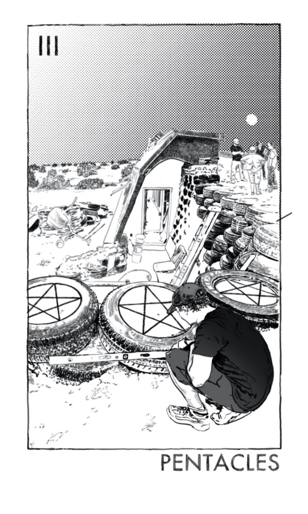 The Three of Pentacles shows a young man working with his tools on a portion of a retaining wall made of tires. Each tire is being packed with earth and he marks the ones he has finished with a star, to mark his personal craftsmanship. He double checks his work with with a level. This is his first time building an Earthship—but he understands this structure to be the epitome of sustainable design and construction. If ‘climate justice’ was in charge of housing, this is what it would look like. The materials have been up-cycled, the plumbing is built for for onsite filtration and irrigation, self-cooling and warming, the home has built in composting and gardening systems. It is off-grid living made livable.