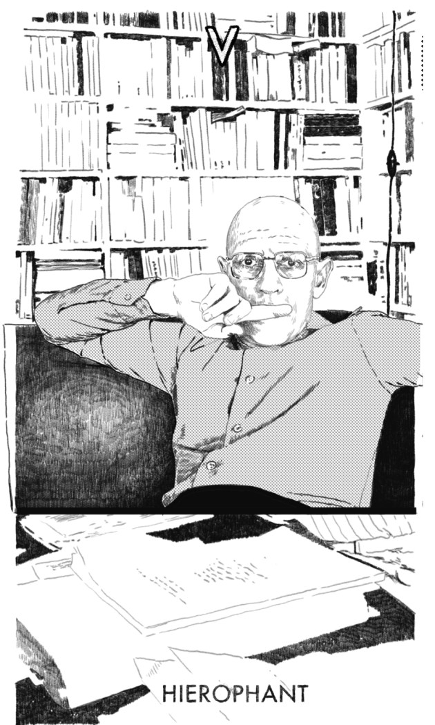 He understands that philosophical work exists not just at the level of conscious quoting of canonical thinkers, but it pulls from deep subconscious impulses and curiosities. He is an intellectual maverick who holds an unlikely but massive institutional authority. Part of his authority stems from the ability to see that ‘power’ is neither good nor bad, instead simply the results of ever-present and ever-changing power relations. Despite the hierophant’s proclivity to deconstruct and expand the concepts and locations of ‘power’—he also rallies every bit of legitimacy and mystique from the ‘great-minds’ of the past. And in doing so he imbues his current position with the type of force that can open up new paths towards a different future. He asks us to pay attention to the axis of power and knowledge.