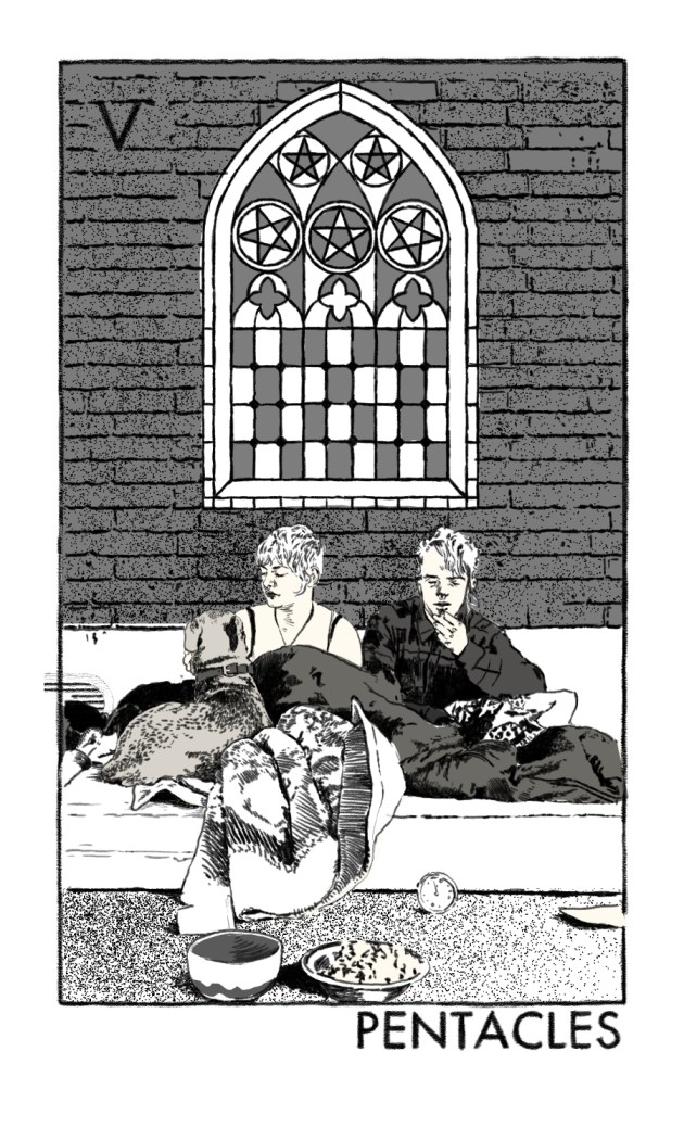 The Five of Pentacles shows two people who have set up camp on the street. It’s that awkward time of year, transitioning from a warm autumn to a very cold winter. It’s getting cooler every night, and the blankets are damp from a sweaty day. One of them is about to smoke the last cigarette, and the other finds comfort in their canine companion. The blankets hide a series of wounds, that are being ignored for the time being. Without care and attention these wounds can fester, and become a more serious problem.