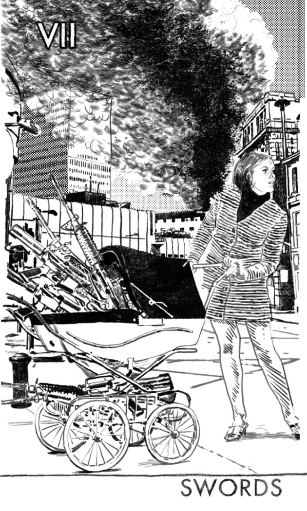 The Seven of Swords shows a woman sneaking off from an explosion in the nearby city-blocks. She whips her gaze across the street, as she skulks away with five 7 assault rifles haphazardly stashed in a baby-stroller. Right now, what she doesn’t realize is that this feeling of being on high-alert, this posture of looking over her shoulder, was about to become a semi permanent state of existence.