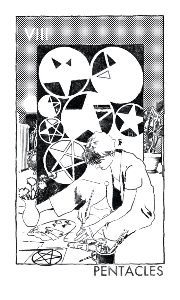 It’s a repetitive process but it has a transcendental rhythm and she loves every precise moment of it. She loves it so much sometimes she feels caught in a perpetual loop of loving the way painting makes her feel. The Eight of Pentacles wants to remind us of the romantic intimacy between a creator and their creation.
