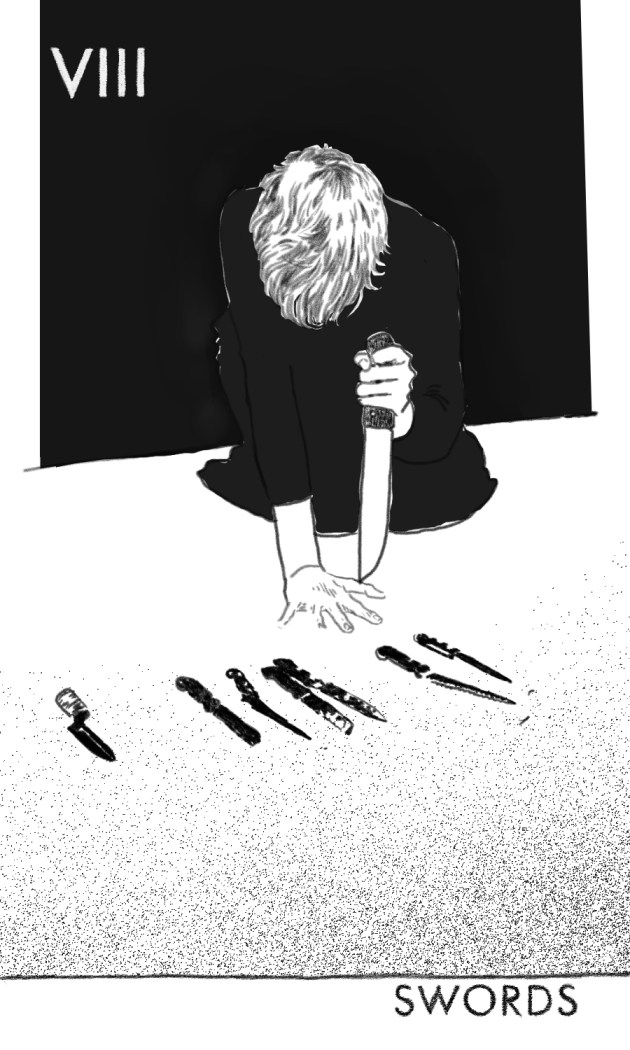 The Eight of Swords shows a figure, head hung low as she plays a five-finger knife game. She is alone, and crouched down on barren floor where she is speeds up the pace with which she can attacks the space in between her digits. Directly, in front of her seven knives are placed in front of her, one to remind her to return to this ritual everyday of the week. She feels that this is simply something she has to do. What began as an eccentric self-soothing habit has become a dysfunction of which she feels powerless.