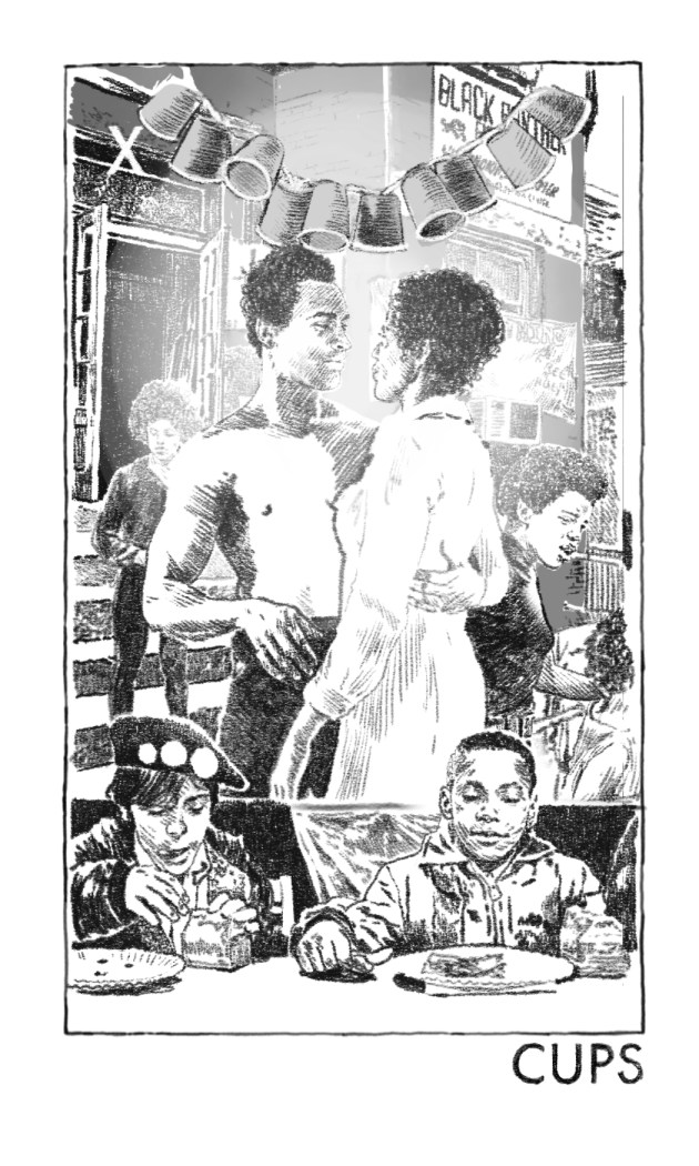 On the Ten of Cups, a loving couple stands together, wrapped around oneanother, the light beams through them. They are surrounded and beautifully welcomed in the frenetic and bubbling energy of the community. Above them the black-panther banners stand proudly, and solo-cups have been turned into celebratory lanterns. Before them, children enjoy a meal and other comforts provided by the power of mutual aid. As they look towards one another they can see this incredible home they have built for themselves, their friends, their kids, and their community. Their home on the hill for the time being feels invincible. It is a fortress—of love, of solidarity, of care, and of guns.