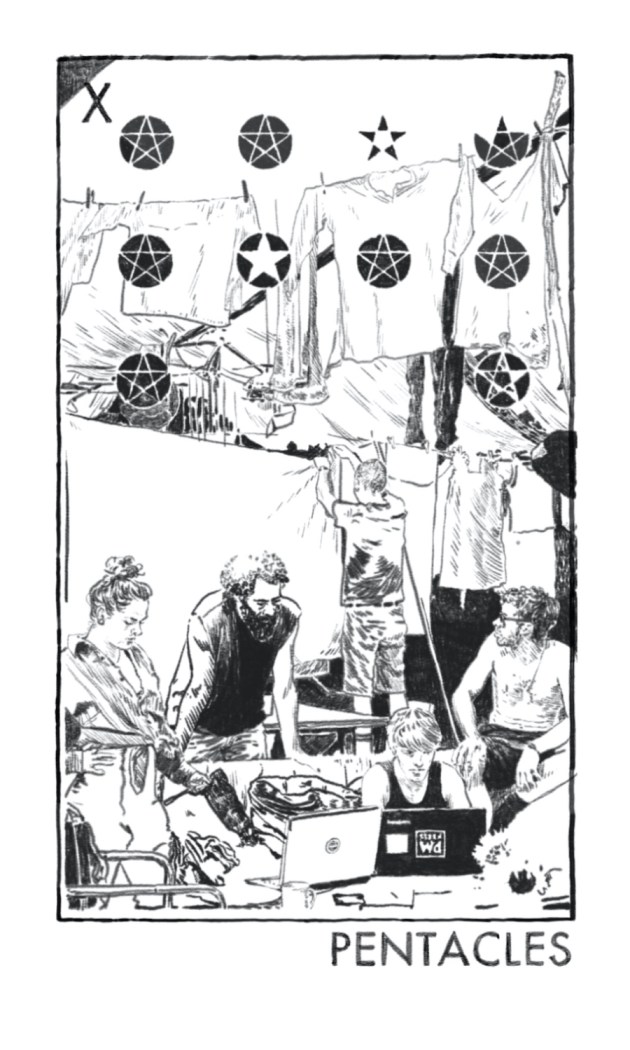 IN DEPTH: The Ten of Pentacles shows an older fellow facilitating a meeting inside a large communal tent. He was once a professor at a nearby university, now he has joined some of his students in the occupation of a forest recently sold off for the purposes of resource extraction. He no longer thinks of himself as teacher, this is partially because after living in this make-shift commune for a year he recognizes, that he does not ‘have the answers’. He is learning, as are his comrades. They are learning about & from one another new ways to work with the forest, with one another, with self-governances and most importantly with themselves. He was glad to abandon his social titles, the capitalist pace of city had drained him. Here under the green canopies he found purpose, and he found himself.
