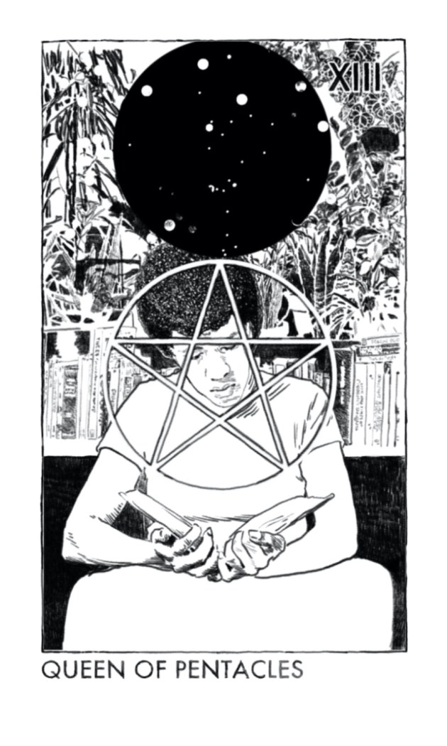 In the Queen of Pentacles, a woman sits on a modest sofa, surrounded by an eclectic library, spanning topics as far reaching as Plants, Vampire novels, quantum theory, and theological texts about Angels.The queen of pentacles approaches the world as narrative—one meant to both be read, and written.