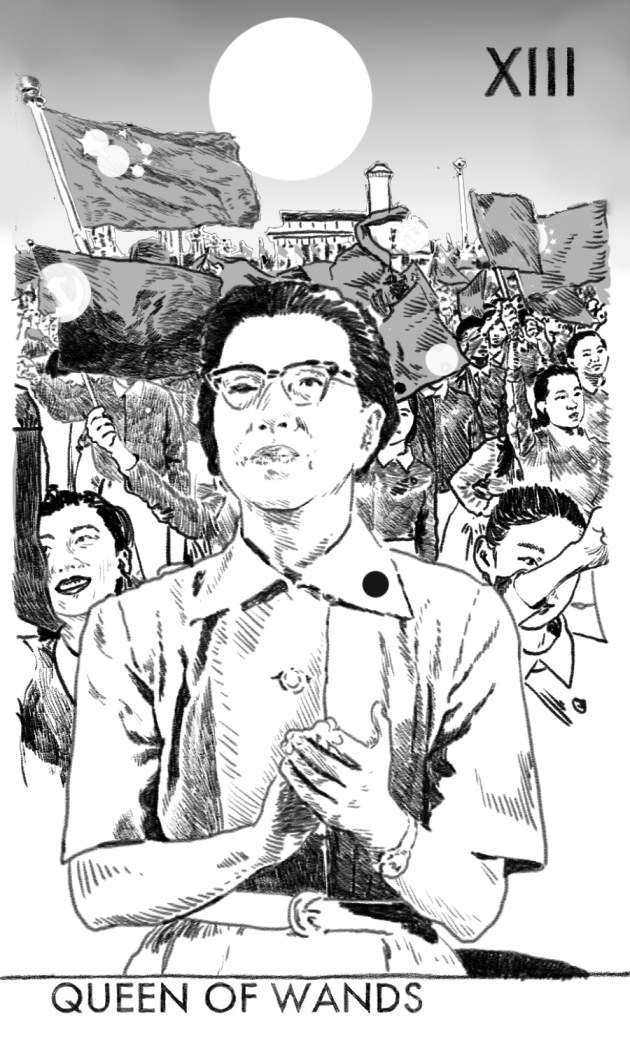 The Queen of Wands imagines Jiang Qing (19 March 1914 – 14 May 1991), also known as Madame Mao, was a Chinese communist revolutionary, actress, and major political figure during the Cultural Revolution. She was Mao’s fourth wife, and Mao was her second husband. She married Chairman Mao in a small ceremony in November 1938 and despite some opposition served as the inaugural “First Lady” of the People’s Republic of China. Jiang served as the Chairman’s personal secretary in the 1940s and used this power of association to take over much of Shanghai’s culture industry. She collaborated with Lin Biao to advance Mao’s cult of personality and unique brand of Communist ideology.
