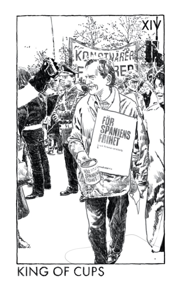 The King of Cups walks amidst a bustling Stockholm protest. He proudly wears a placard that reads ‘FOR A FREE SPAIN’, and gleefully engages passerby’s in discourse and debate. He is well-versed in domestic and international policy… and he seems to have and answer for everything. His wife sweetly locks arms with him. Behind them, a cop looks on surveying the scene. An ominous glove swings out from just behind him, and it is here that our modest every-man shows his stately ranks. Beer-in-hand, the incoherent stranger begins hurling accusations. The King of Cups has strong reflexes, he whips his head around and replies, “I’m sorry that you’re are hurting in this way. I will do my very best to see that you get the help you need.” and then just keeps walking. It’s a strange and disarming exchange. The King of Cups understands this is the cost of power.