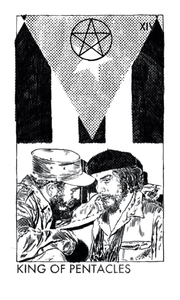 Our King of Pentacles features these two comrades of the Cuban Revolution: Fidel Castro (13 Aug 1926 – 25 Nov 2016) and Ernesto “Che” Guevara (14 Jun 1928– 9 Oct 1967). This complicated relationship has been the subject of much speculation and intrigue. Here these men are invoked to draw attention to a particular approach to political power.