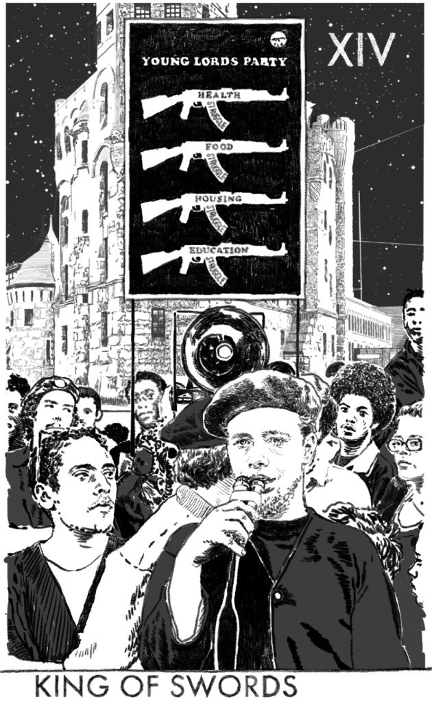 Our King of Swords is takes direction from the Young Lords Party of the late 1960’s and 70’s. Initially a Chicago-based street gang that became a civil rights organization that expanded operations to various neighborhoods in New York and later they organized in Puerto Rico with regional Independence movements. The political organization was founded in 1968 when Cha Cha Jimenez brought the political and intellectual radicalization he experienced while in jail, back to his Chicago street gang re-directing the groups activity against gentrification and US imperialism rather than against rival gangs. The YLP worked in coalition with the National Black Panther Party Office in Oakland and the Black Panthers in Chicago, they were a part of Fred Hampton’s Rainbow Coalition, and also worked with groups of the Puerto Rican Independence Movement, Lincoln Park Poor People’s Coalition, Northside Cooperative Ministry.