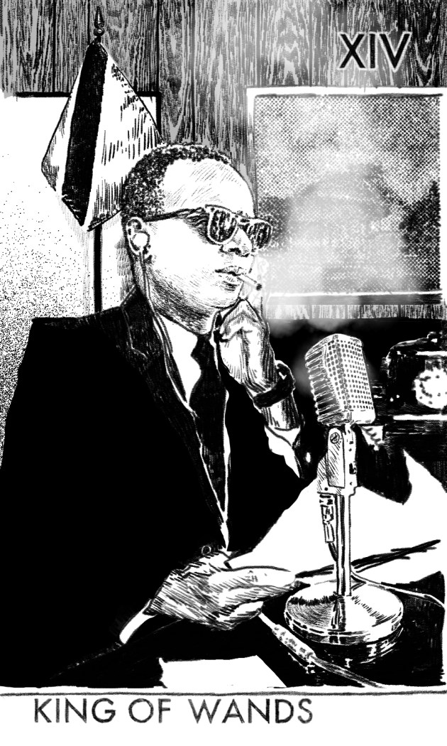 The King of Wands sits at his presidential desk behind a microphone from which he is able to address the people. He wears sunglasses indoors, and he listens with a hearing aid. He holds notes in one hand and his other hand seems to disappears behind the swirls of cigarette smoke. He is articulate, incisive, and yet intellectually accessible. His words drift through the smoke, through the air wave, and into the hearts of the many. The way he speaks of us, changes how we feel about ourselves.